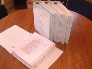 This photo depicts a typical submission for a Class II, computer driven medical device with proprietary software. This application is currently before the Center for Devives and Radiological Health. It is under going a round of questions for additional information, as of September 2001. This includes the three original volumes submitted and one volume necessary to respond to the questions. Recently CD's are allowed. There is a tradeoff between the paper and CD's. We will advise you.